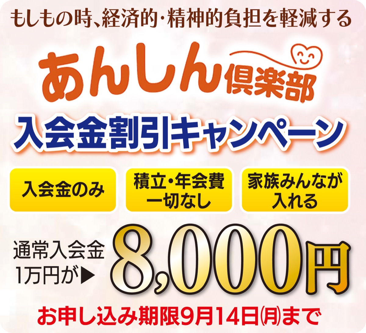 もしもの時に精神的、経済的不安を軽減する「あんしん倶楽部」は8万人を超える方が加入する同社の制度。年会費・積立金は一切不要で、式場使用料50%割引、葬儀基本コース20%割引のほか提携協力店のサービスまで家族全員が様々な特典を受けられる。9月14日(月)まで、入会金10000円が8000円になるオープン記念キャンペーンを開催中。問合せは下記へ。
