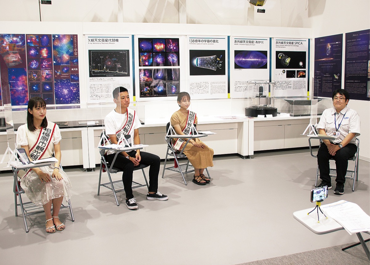 この日は、第14代市観光親善大使の岩永優花子さん(20)、鈴木朝登さん(19)、西島芽さん(22)が同研究所の宇宙科学探査交流棟を訪問。広報担当の大川拓也さんに取材して、その様子を動画で撮影した。