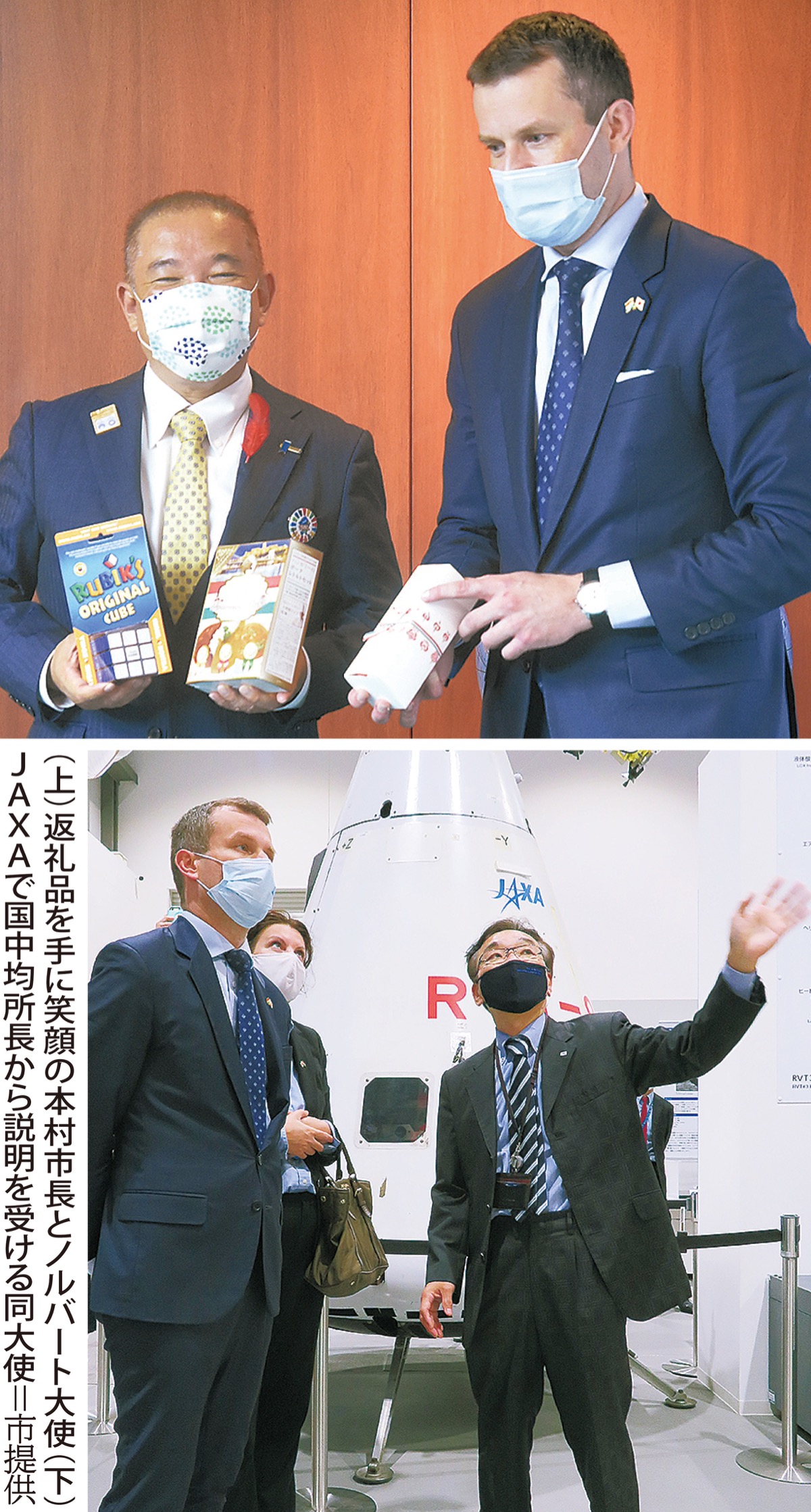 本村市長から記念品として津久井の伝統的な組紐でラッピングされた市内で生産した日本酒や箸が贈られると、ノルバート大使からはこけし人形、ハンガリーの代表的なスープである「グヤーシュ」のセット、ハンガリーが発祥で日本でも人気の高いルービックキューブを返礼品として手渡した。同席した相模原弥栄高校の小川さんと小澤さんも昨年研修旅行で訪れたハンガリーの思い出をつづった本をノルバート大使に渡すなどして交流を深めた。
