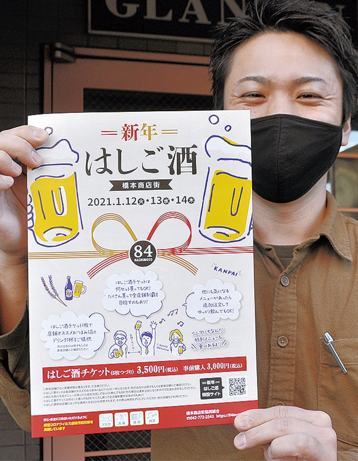 新型コロナウイルス感染症の影響による飲食店の売上減に対応しようと、橋本商店街協同組合(古橋裕一理事長)は来年1月12日(火)・13日(水)・14日(木)の3日間、「新年はしご酒」事業を行う。国の指針に基づき感染対策に細心の注意を払い、参加者を「おひとり様」など「4人以下」に限定。同組合事務局は「忘年会・新年会シーズンにほとんど予約が入らず、飲食店は苦慮している。対策を万全に行いながらお客様に満足してもらえるよう、新しい生活様式のイベントとして試行したい」と話している。 (12月17日起稿)