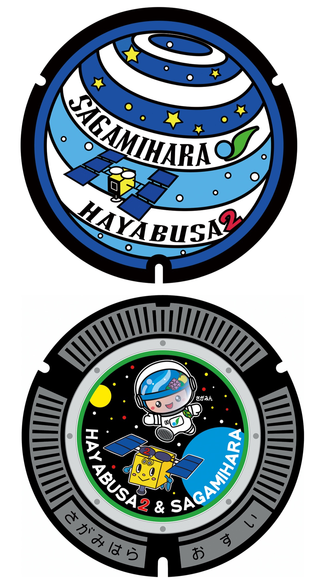 探査機・はやぶさ2のカプセルが小惑星リュウグウからの地球帰還に成功したのを記念し、相模原市はこのほどJAXA宇宙科学研究所(宇宙研)と協力してオリジナルデザインのマンホール蓋(ふた)を製作した。2月12日(金)午後、市内2カ所に設置される。はやぶさ2の世界的偉業をたたえるとともに、設置地域の魅力アップや下水道事業の理解促進に向けた契機づくりをねらう。こうしたはやぶさ2関連事業について市は、新型コロナウイルスの感染状況を見ながら随時行っていく。