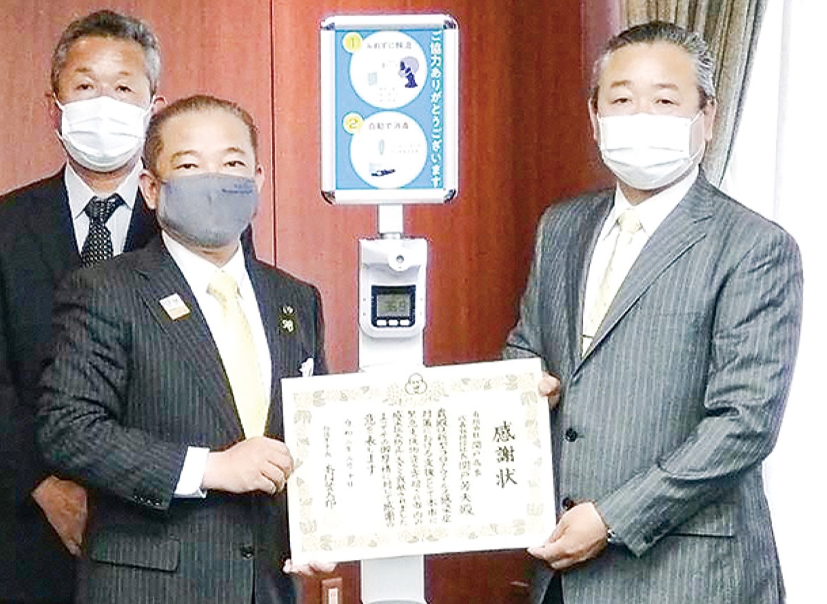 (有)関戸商事(青野原/関戸芳夫社長)は10日、本村賢太郎市長を訪れ、検温器付き消毒ディスペンサースタンド30台を市に寄贈した。