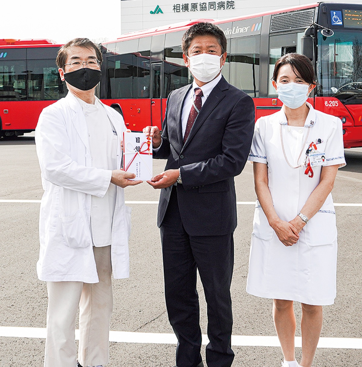 神奈中バス労働組合連合会(小野澤賢也会長)は17日、相模原協同病院(井關治和病院長)を訪れて、同院の医師や看護師をはじめとする医療従事者1250人に対し、神奈中グループで運営しているミスタードーナツの商品券を贈呈した。