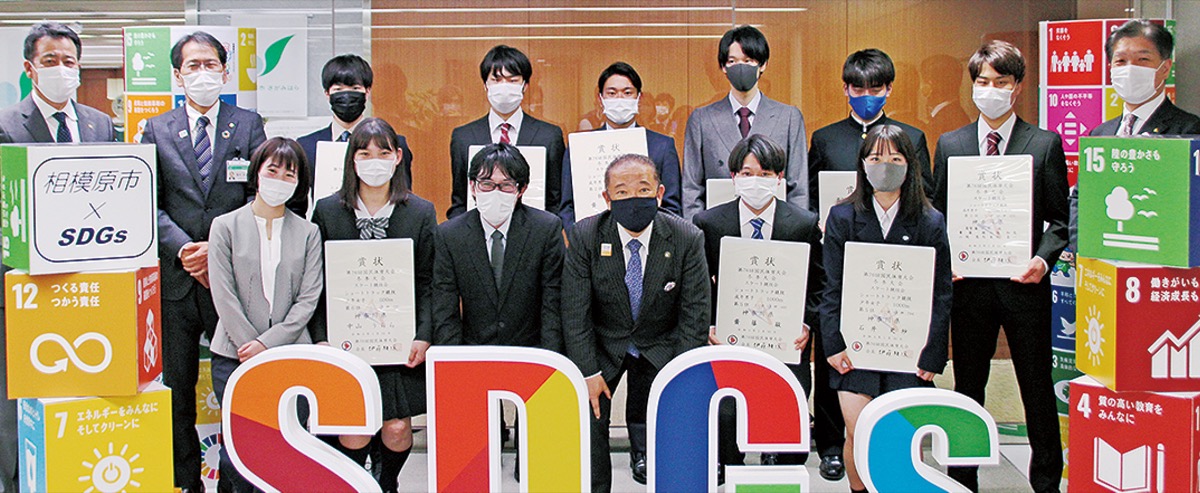 「相模原スピードスケートクラブ」(SSC)の池英徳監督、齋藤仁美コーチと、在籍する齋藤慧、河合健朗、齋藤駿、山越和馬、山越龍馬、石井桜汰、中山うらら、石井更紗、榛村慧の9選手が3月30日、市役所を訪れ、第76回国民体育大会冬季大会スケート競技会(ショートトラック)での入賞を本村賢太郎市長へ報告した。