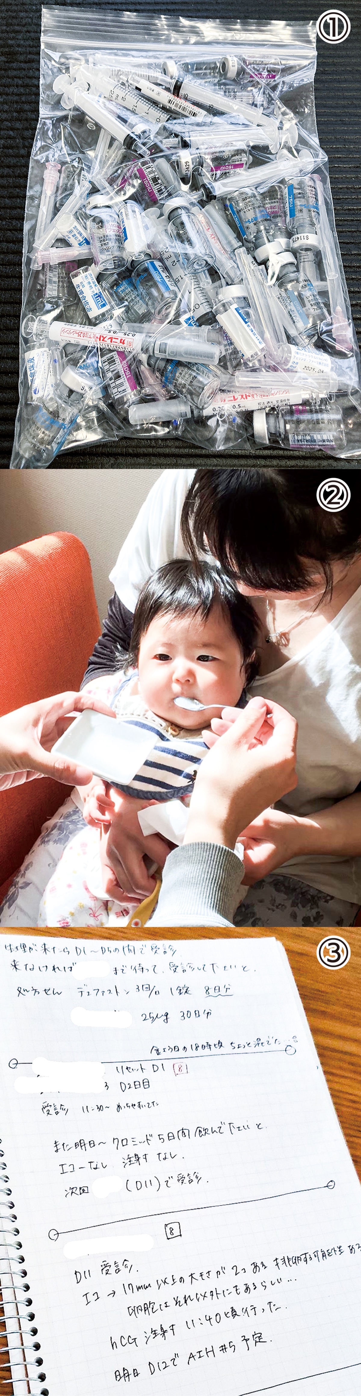 「原因がわからないのなら、やるしかない」。主治医と話し合いながら治療法をステップアップさせていき、体外受精(卵子と精子を体外に取り出し受精させ、受精卵を子宮内に移植する方法)まで行き着いた。木下さんの場合、1回の体外受精のために4・5回は通院し、採卵・受精、移植などを行う。成熟した卵子を育てるために投薬や注射も欠かせない。