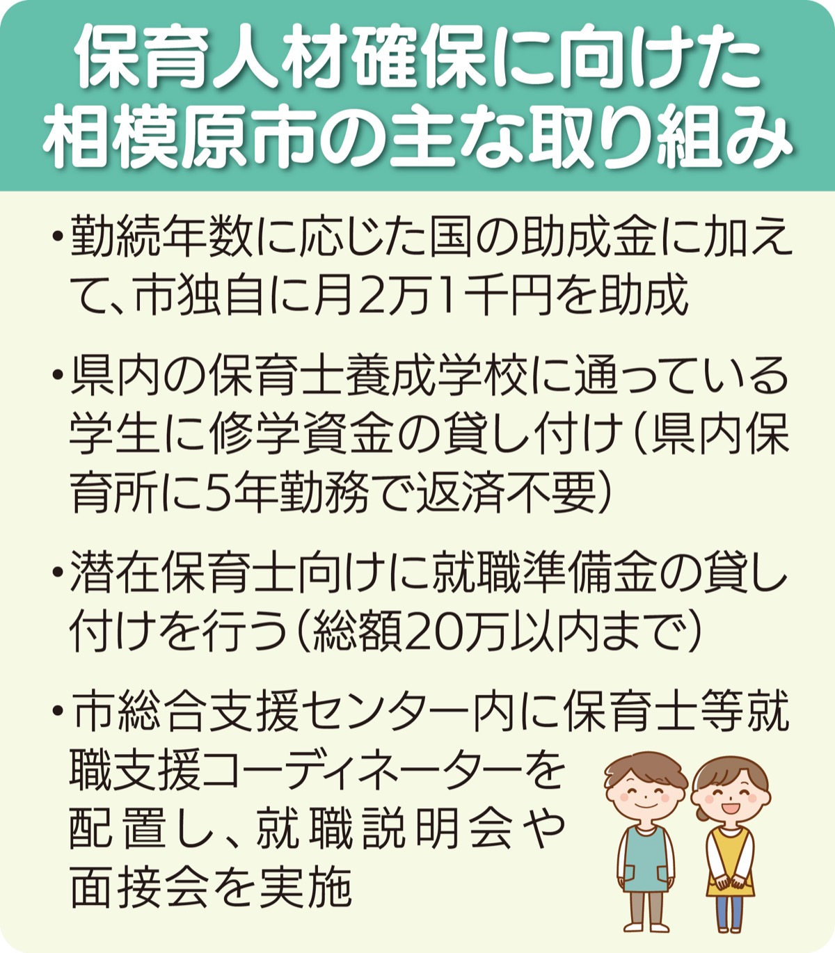 まず、処遇向上に向けて市内の保育士を対象に市独自の助成を実施。また、保育士養成校に通う学生向けの修学資金貸し付け事業、加えて潜在保育士の就職を後押しする就職準備金の貸し付けや就職相談会などを行うことで、保育士が長く仕事を続けられる環境づくりを図っている。