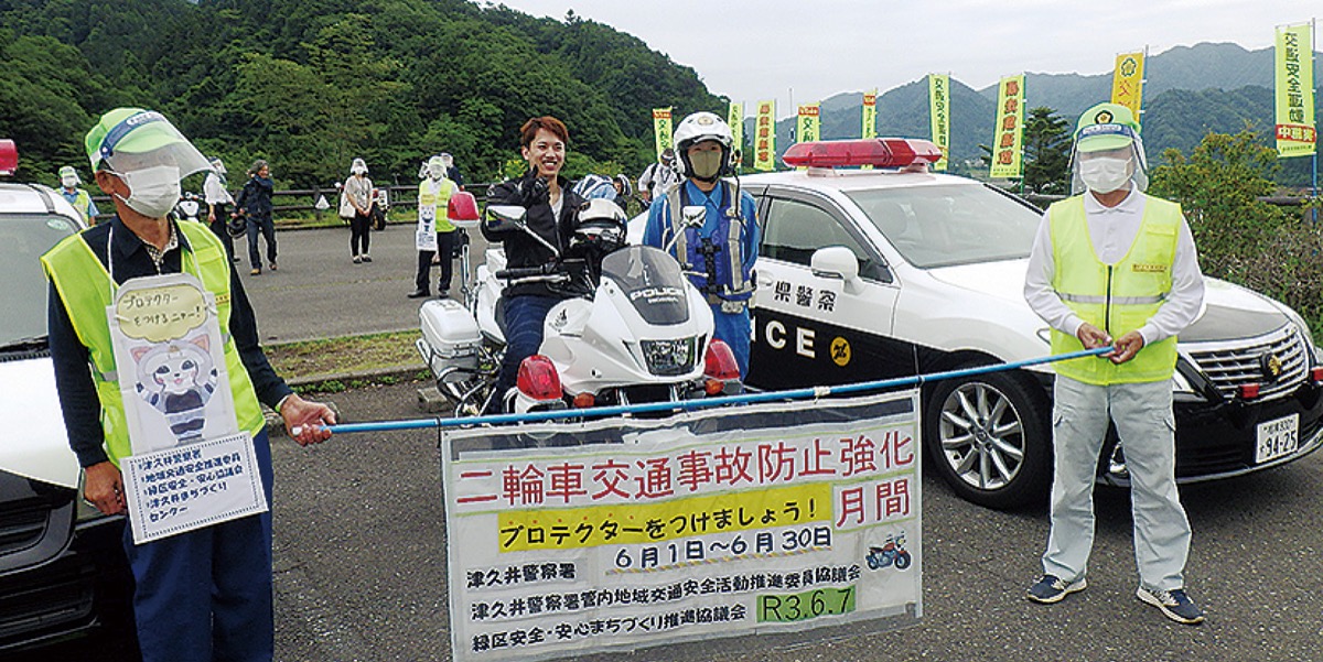 二輪車事故防止を呼び掛けるキャンペーンが6月7日、鳥居原ふれあいの館駐車場で行われた。