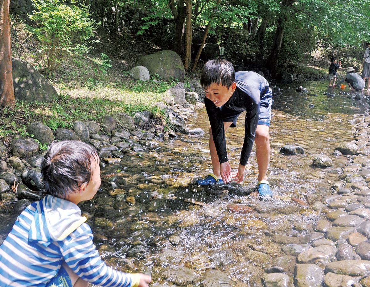 相模川の豊かな自然に囲まれている同公園内には「四季の小川」と呼ばれる水辺があり、8月31日まで放流されている。