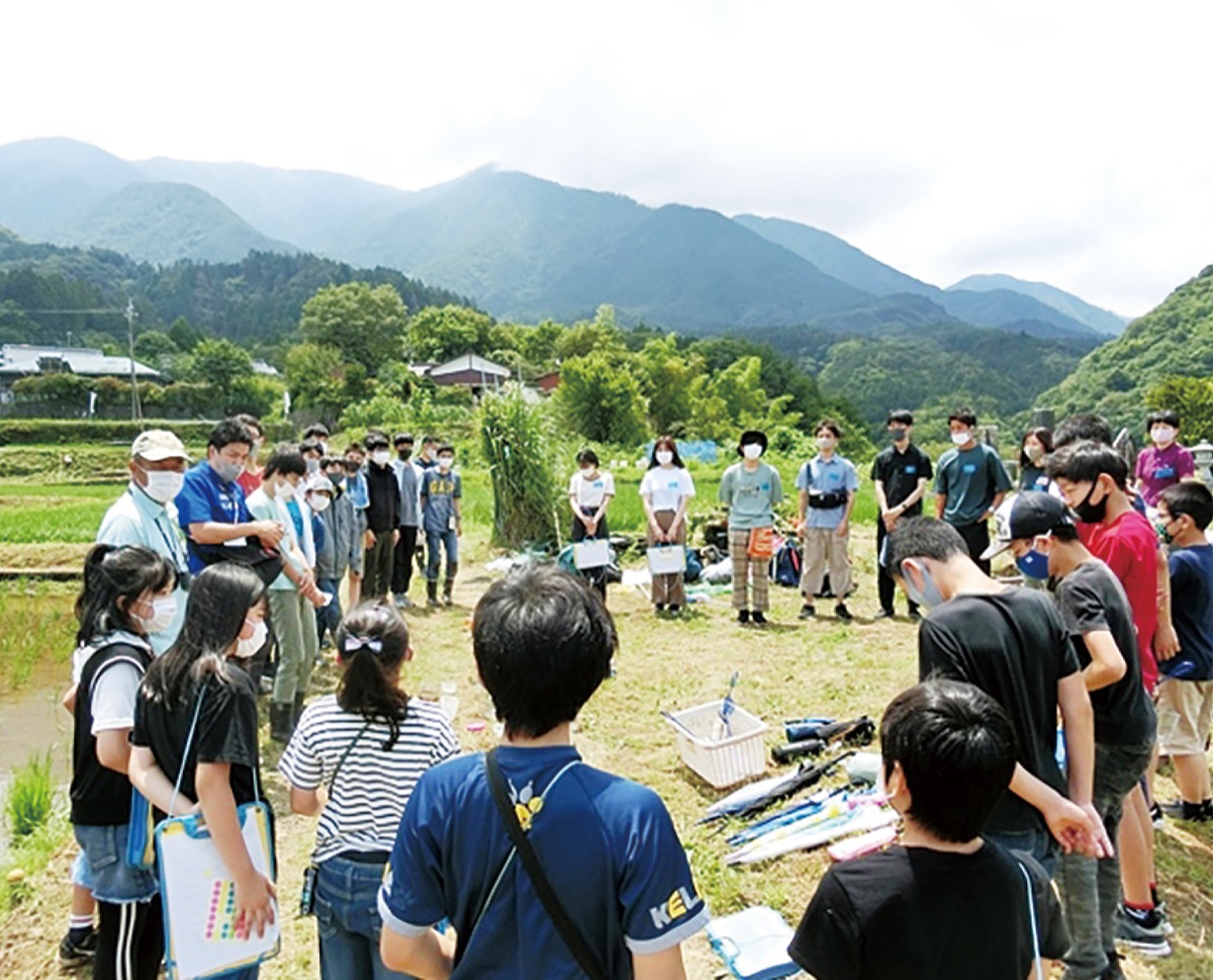 今回は、1・2年生は青根地域に伝わる民話「折り花姫」を聞き、コスモス畑で種まきを実施。3年生は旧青根小学校の前にある畑でのりんご栽培、4年生は道志ダムや青根キャンプ場探索、5年生は田んぼでの水生生物の観察、6年生は特別養護老人ホーム青根苑を訪問した。7年生は地域の魅力を発表するとともに青山学院大学コミュニティ人間科学部の学生と一緒に地域の魅力について議論、8・9年生は地元のオギノパンの荻野隆介社長を招き、講話を聞いた後、地元の水源林を観察した。