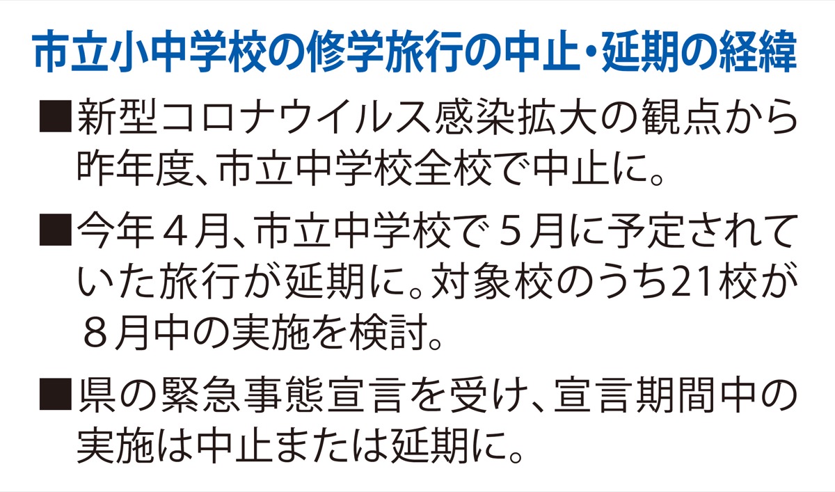 中学校は2度目の延期となったが、学校側の判断によっては来年2月までの期間で実施の可否が検討される。5月の旅行が延期になった際、9月、10月、11月、来年2月に実施を決めた学校もある。ただ、市学校教育課の担当者は「9月以降は受験期に入るため、日程調整は難しいのではないか」と話す。