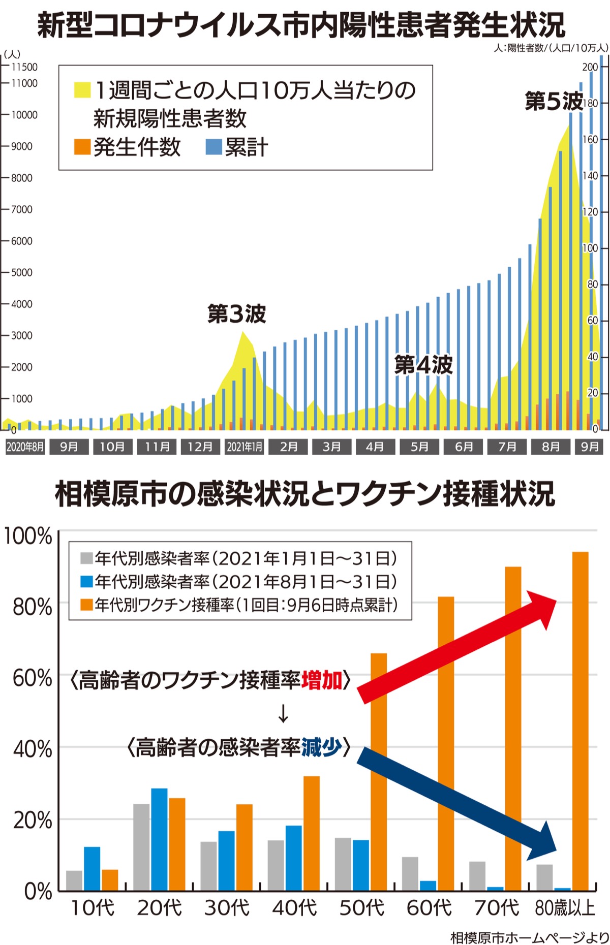 65歳以上の高齢者のワクチン接種率が8月25日時点で約90%に達するなど増加する中、その効果も顕著にみられる。市がホームページで公表している、今年1月と8月の年代別の感染者率、ワクチン接種率を比較した感染状況とワクチン接種状況(図下)によると、第5波の最中であった8月中の感染者率は80歳以上が0・9%、70代が1・2%、60代が2・9%と高齢者の感染者率が低下。市はワクチン接種により発症を抑えられているとの見解を示している。