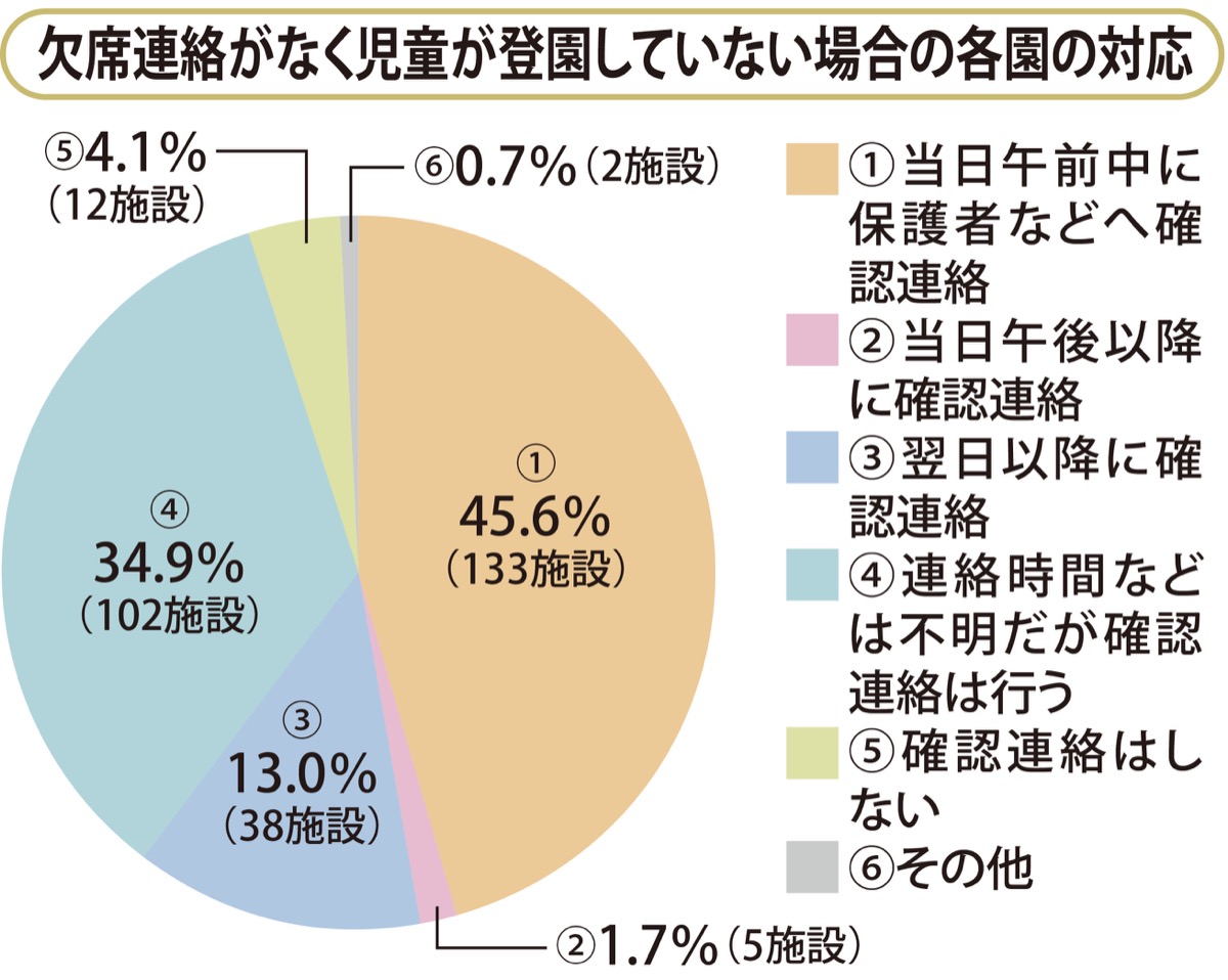 また、福岡県の事故では、園児の出欠確認不足も課題として上がった。調査結果では、292全施設で朝の会などでの出欠確認を行っている。しかし、欠席の連絡がなく、児童が登園していない場合は、【1】当日午前中に保護者などへ確認連絡…133施設(45・6%)【2】当日午後以降に確認連絡…5施設(1・7%)【3】翌日以降に確認連絡…38施設(13・0%)【4】保護者などへの確認連絡は実施(連絡する時間などは不明)…102施設(34・9%)※アンケートへの記載内容から連絡時間が不明な回答含む【5】保護者などへ確認連絡はしない…12施設(4・1%)【6】その他…2施設(0・7%)と対応が分かれる結果になった。