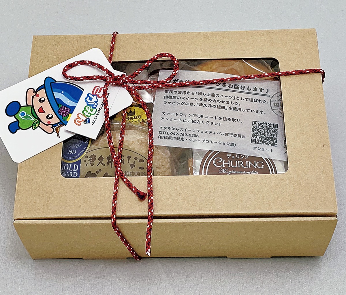 フェアでは市民に選ばれた「推し土産スイーツ」のギフトセットも販売する。「さがみはら推し土産スイーツ」とは、さがみはらスイーツフェスティバル実行委員会で3回にわたり実施した「推し土産スイーツ総選挙」の受賞品。今回はそのスイーツを集めたギフトセットを用意。数種類の「おすすめセット」(1500円程度)のほか、好みのスイーツを詰め合わせることもできる。相模原市マスコットキャラクター・さがみんのメッセージカード型のタグと津久井産の組みひもを使用した、相模原らしいギフトセットに仕上がっている。