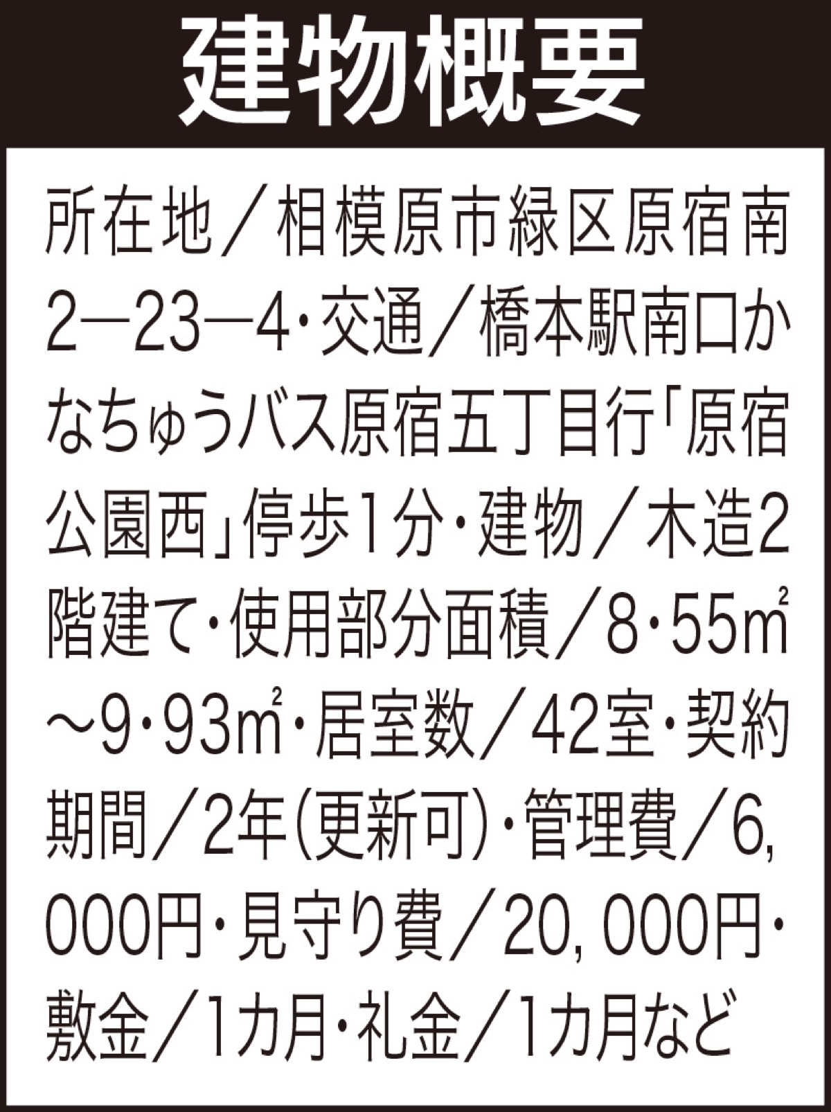 家賃は4万6千円から。他に管理費や見守り費が必要で、合計で7万2千円から。照明とエアコン、洗濯干し、スプリンクラー、自動火災報知機を設置。風呂やトイレは共用。申し込み・問い合わせは、同社【電話】042・851・5182へ。