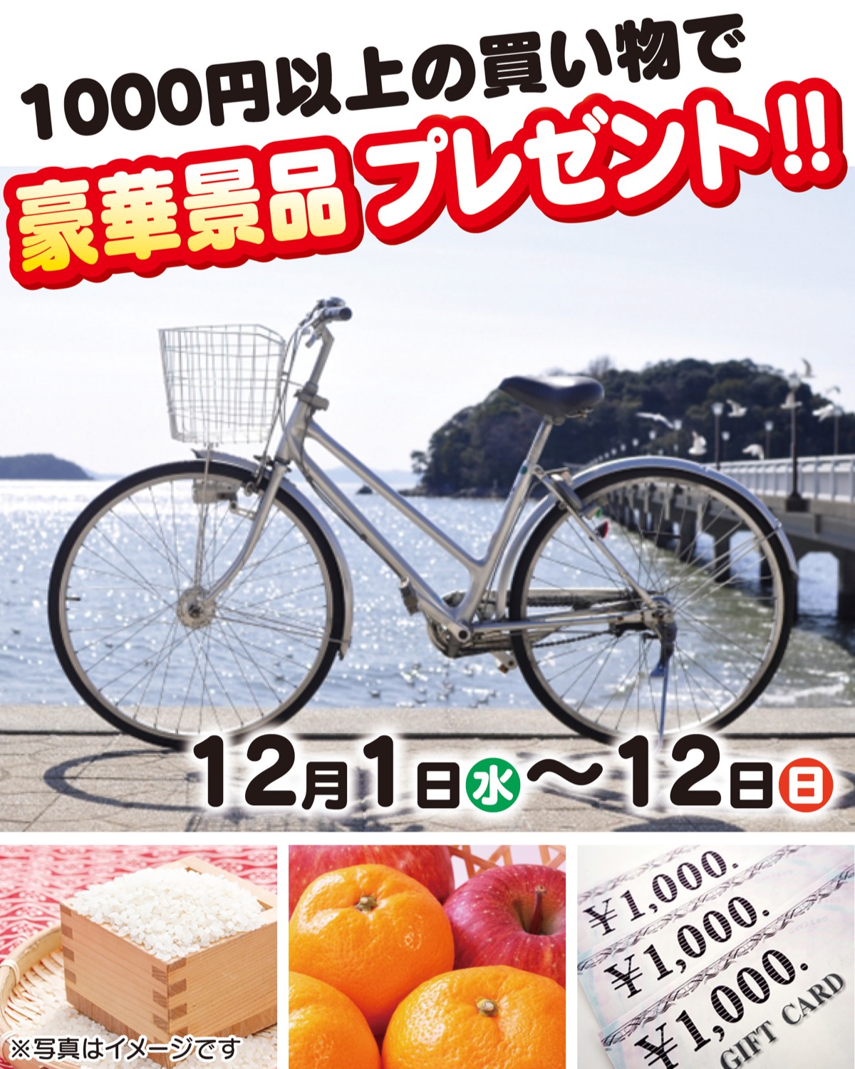 第1弾は「わくわく年末大感謝祭」。参加店で1回千円以上買い物すると、応募券を1枚ゲット。自転車やお米(5kg)、果物、商店街飲食店の食事券などが当たる抽選に応募できる(12月1日(水)〜12日(日))。