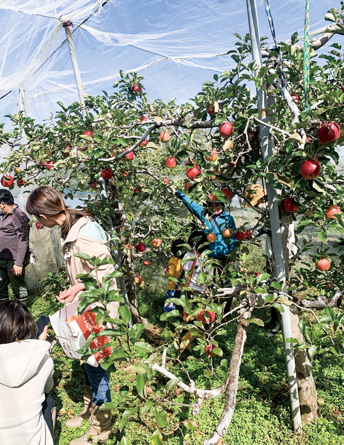 農園会は、青根酒米作りの会(石井好一会長)と協働で酒米作りを行っている。10月24日には上青根りんご倶楽部も、青根地区の畑で育てている真っ赤に色づいたりんごの収穫体験を行い、参加者は楽しそうにもぎ取っていた。