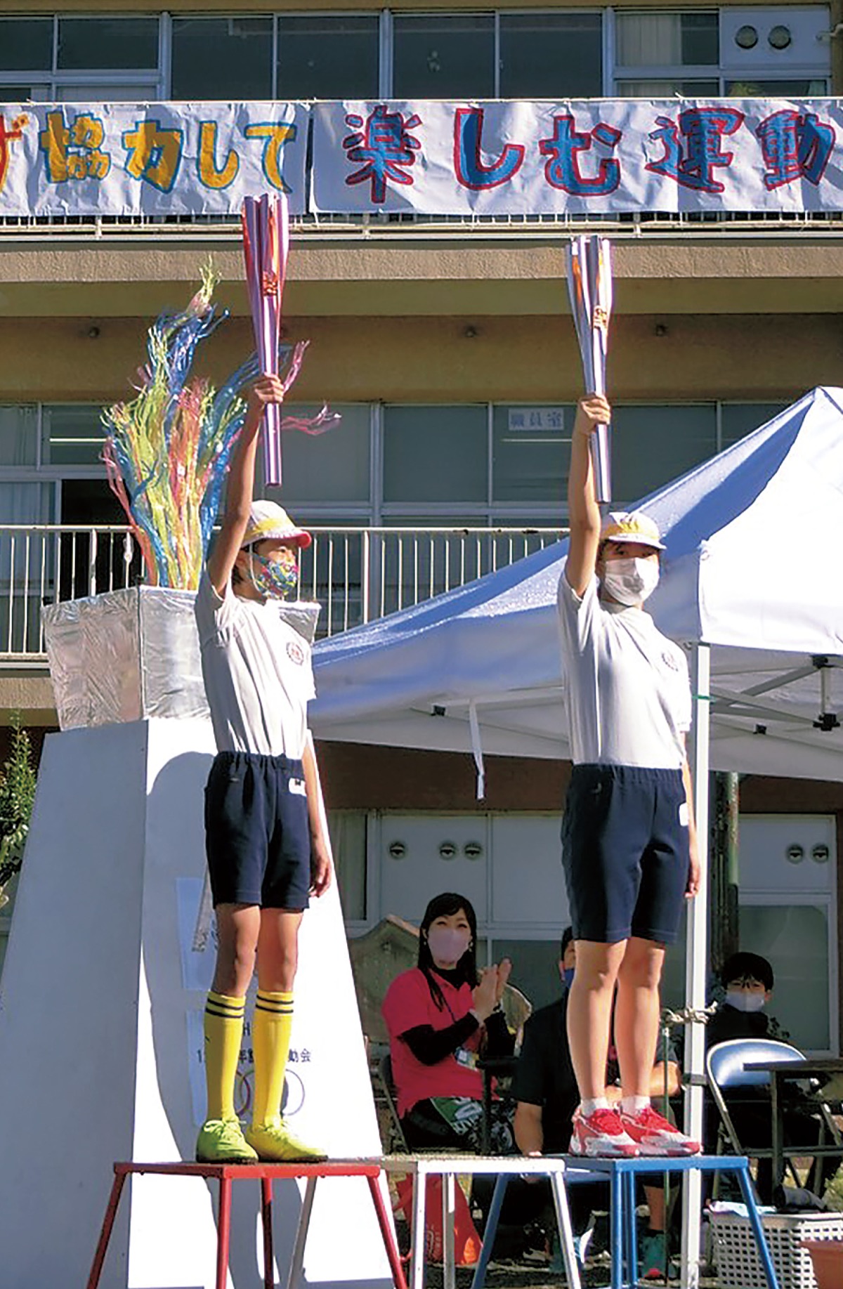 当日は、5・6年生各2人がトーチを掲げながら校庭をリレー。教員手作りの聖火台にトーチを近づけると、聖火を模したすずらんテープが扇風機の風で「点火」。児童や保護者たちからは大きな拍手が沸き起こった。走者の一人だった角田琉晴さん(6年)は、「保護者や学校の人に笑顔で手を振って、本物の聖火ランナーのような気持ちになった」と顔をほころばせた。