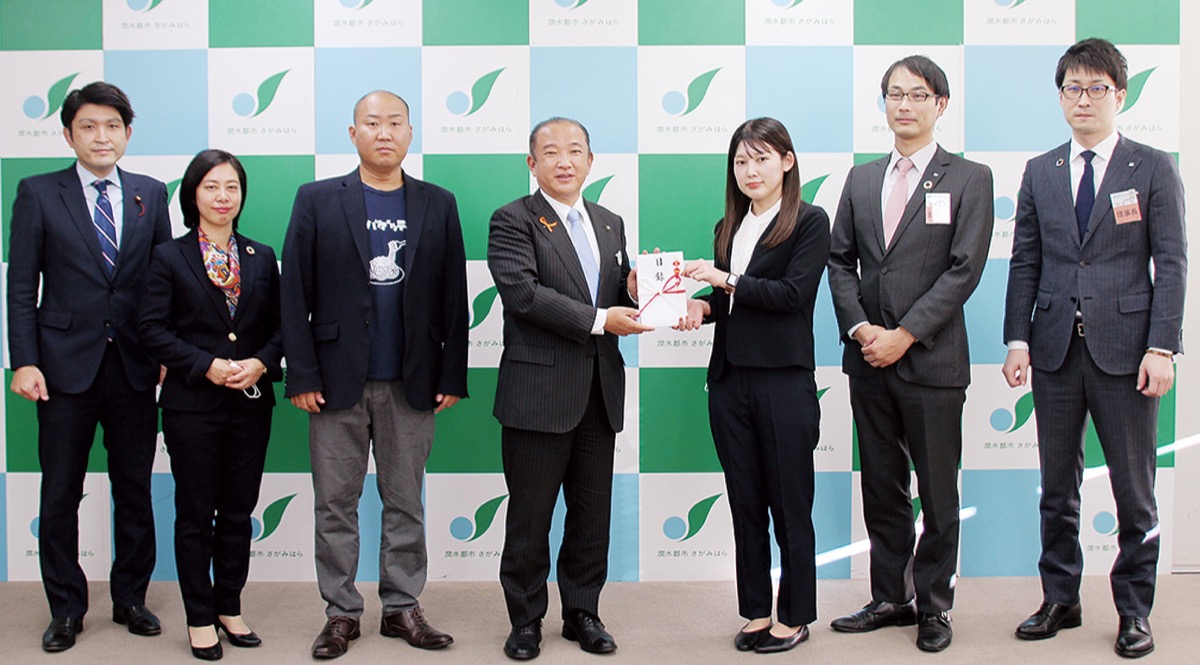 当日は販売グループの代表会社「S.C.D」の篠原博子代表や相模原スパゲッティ協会の和知達也会長らが市役所で寄付金を贈呈。本村賢太郎市長は謝辞を述べ、「日本一のスパゲティのまちをめざすという、とても良い取り組み」と語った。篠原代表は「売り上げものびているので、寄付も増やせる。市民の皆さんにもっと食べていただき、名物にもつなげていきたい」と話した。
