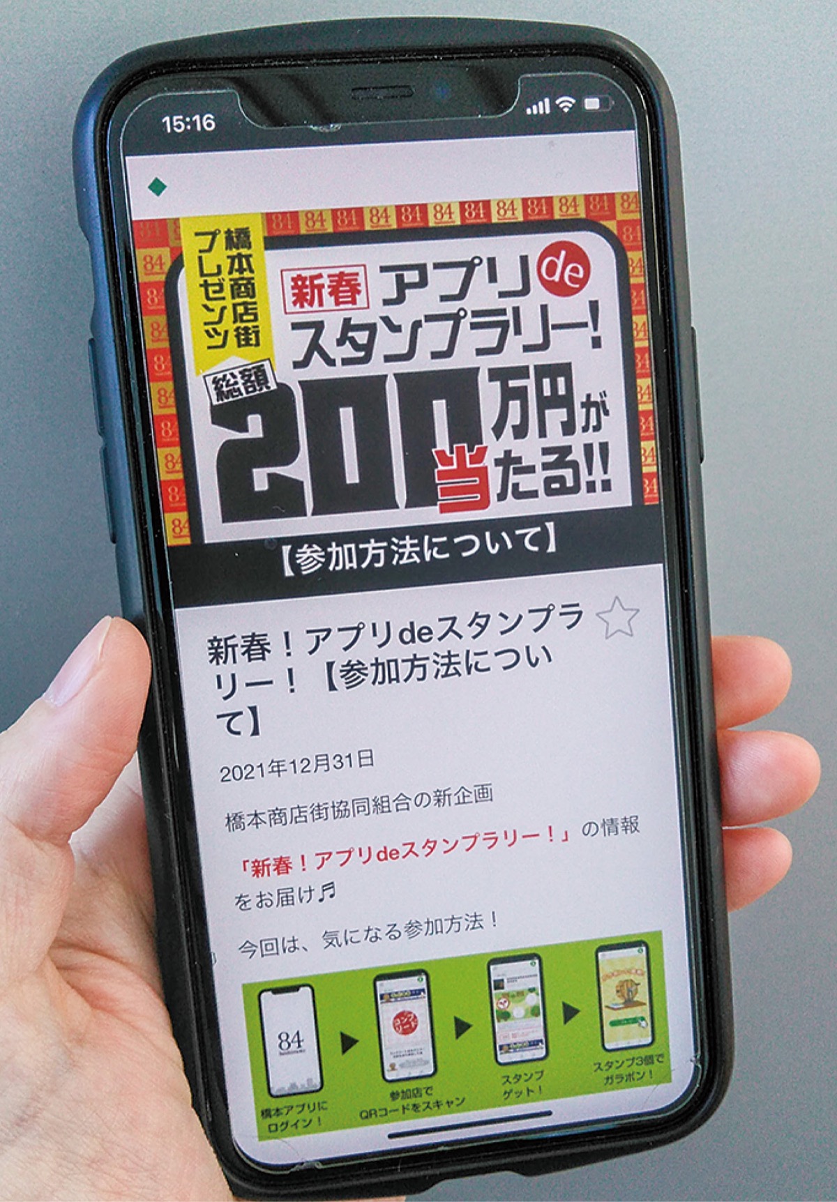 地域住民や来街者に、街や個店の魅力を知ってもらうイベント「新春!アプリdeスタンプラリー!」が橋本商店街協同組合(古橋裕一理事長)で始まっている。同商店街が運用する「アプリ」を活用したスタンプラリーで、ポイントエリアを巡ると賞品が当たる楽しさはそのままに、人との必要以上の接触を避けながら街の回遊性を高める現代版スタンプラリーとなっている。
