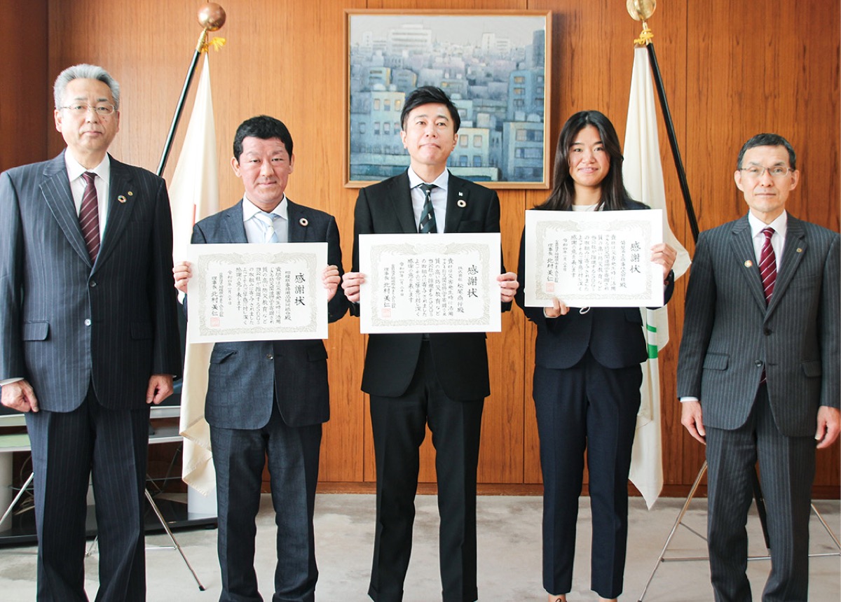 相模原事務用品協同組合と菊屋浦上商事、松尾商行は20日、同じさがみはらSDGsパートナーである公益財団法人相模原市まち・みどり公社へ災害発生時に活用できる防災関連用品を寄贈したことを受け、同公社から感謝状を贈呈された。