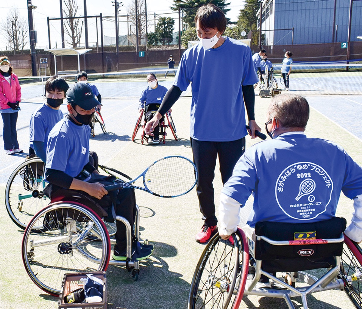 中澤氏とプロ車いすテニス選手でパラリンピアンの眞田卓氏、元女子プロテニス選手の小畑沙織氏が講師を務め、市内にゆかりのある中学生以上のテニス経験者(一般)と健常な小学生、四肢に運動障害がある児童・生徒、合わせて30人がイベントに参加した。
