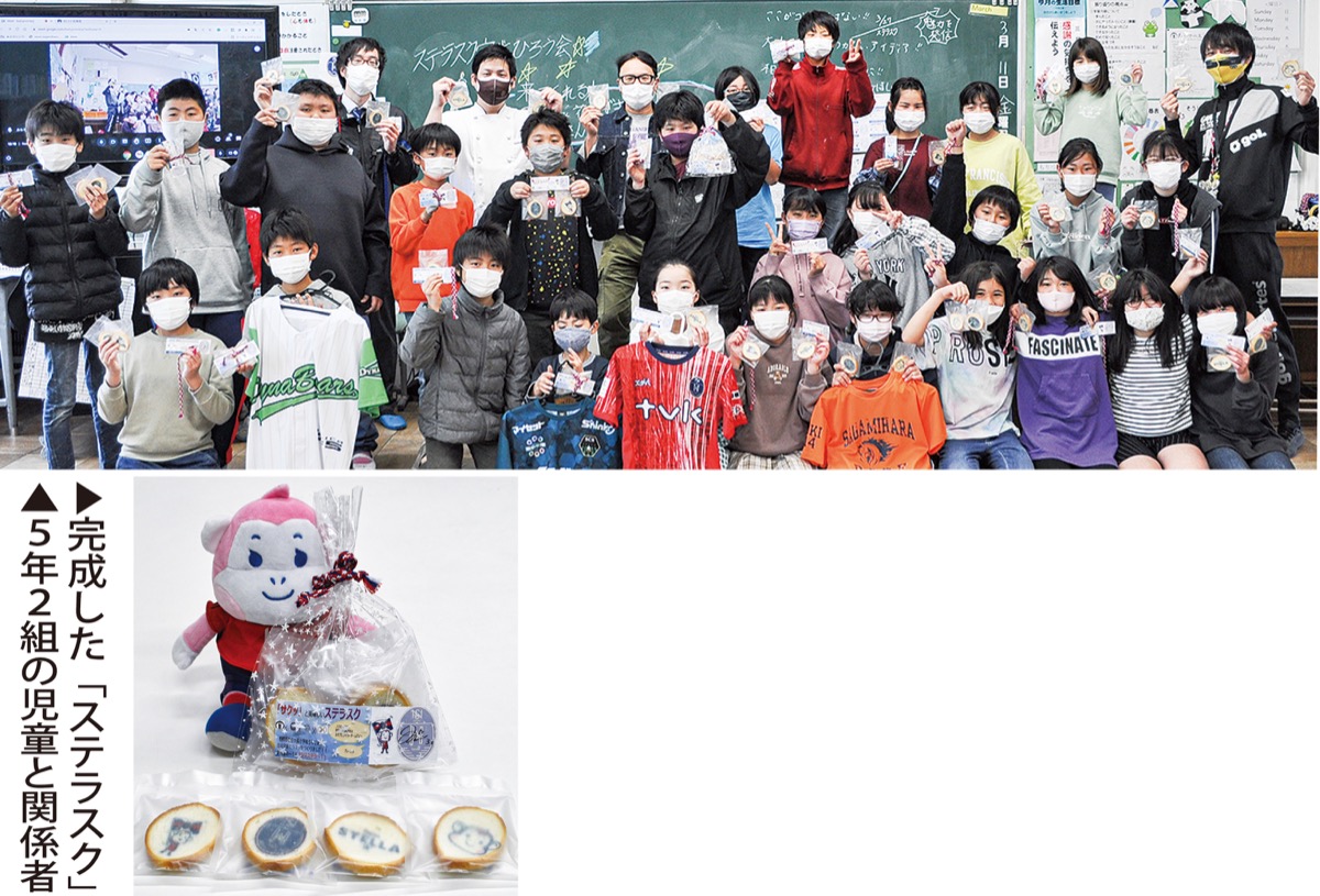 早速チームに打診すると、中央区の洋菓子店「花みずき」を紹介してくれ、同店にラスク制作をお願いしたところ快諾。児童らのアイデアを取り入れた『ステラスク』がこのほど完成し、11日に5年2組の教室でお披露目された。
