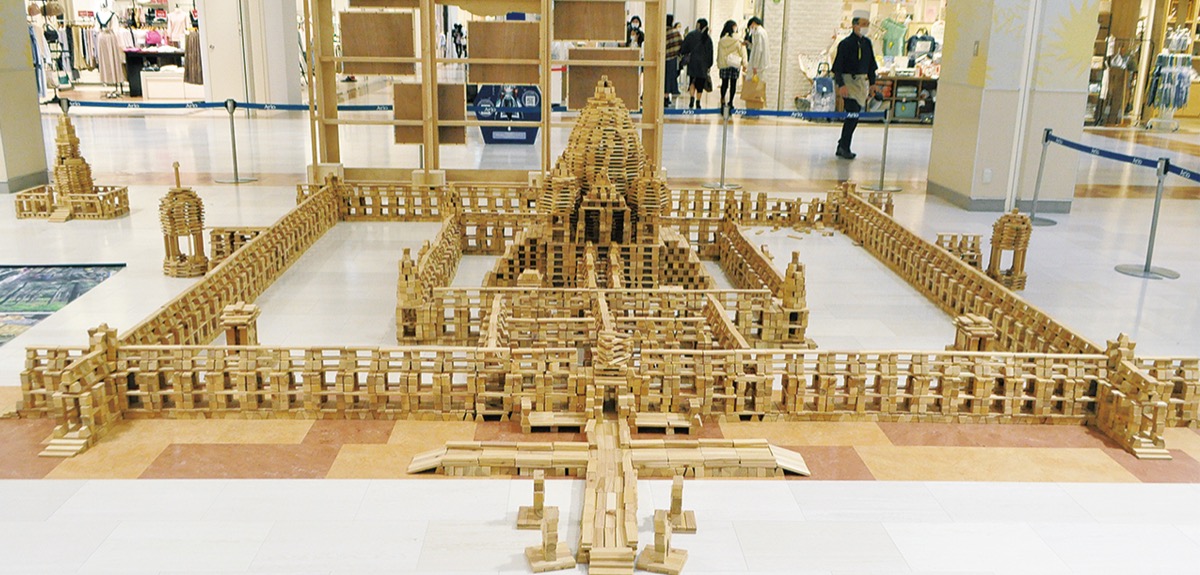 アリオ橋本の1階で4月10日(日)まで、間伐材ブロック3万個を使ったアンコールワットが展示されている。