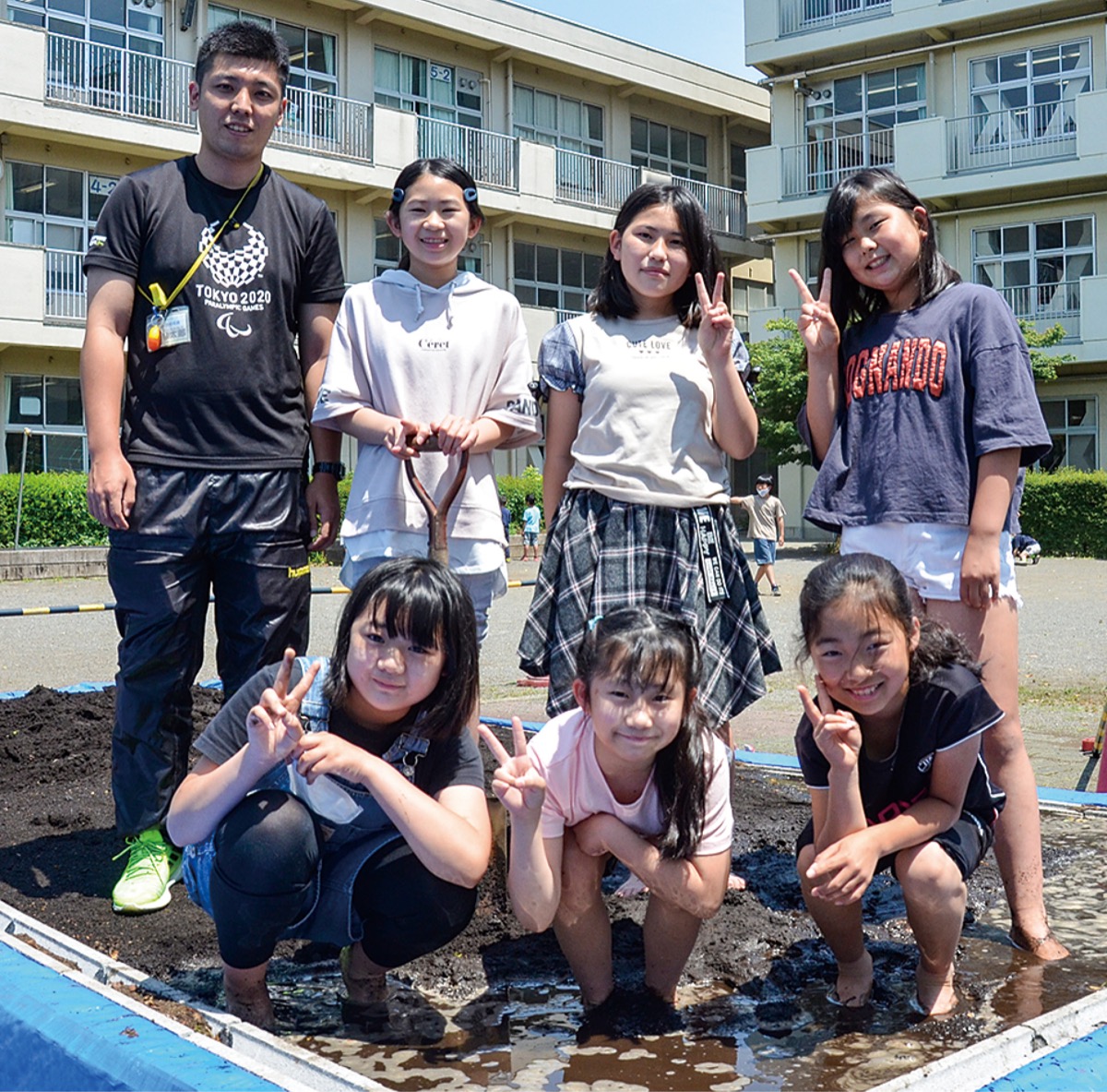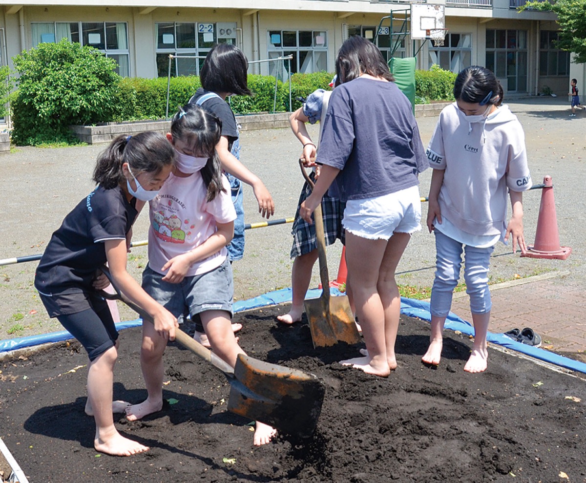 児童が一から田んぼを作り、そこで稲作を行う計画で、5月30日には6人が中心となって土を耕した。この水田は縦2m、横5・5mほどの穴の上にビニールシートを敷き、コンクリートブロックで周囲を枠どったもの。児童は、休み時間も水田づくりを行い、「大変だ」と言いながらも楽しそうに作業を行った。