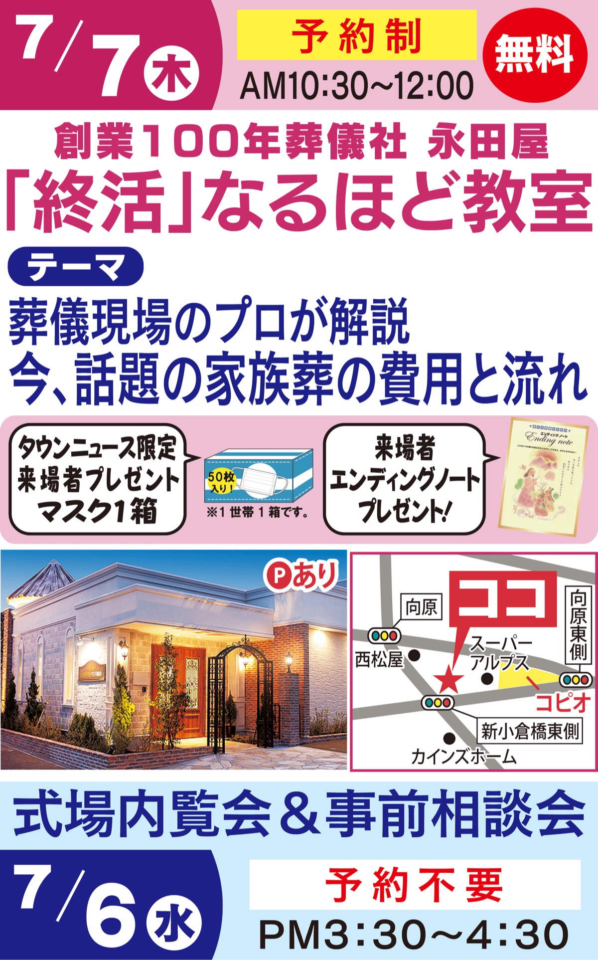 葬儀社・(株)永田屋の「終活」なるほど教室が7月7日(木)、メモリアルハウス城山で開かれる。参加無料。午前10時30分から正午。予約制。