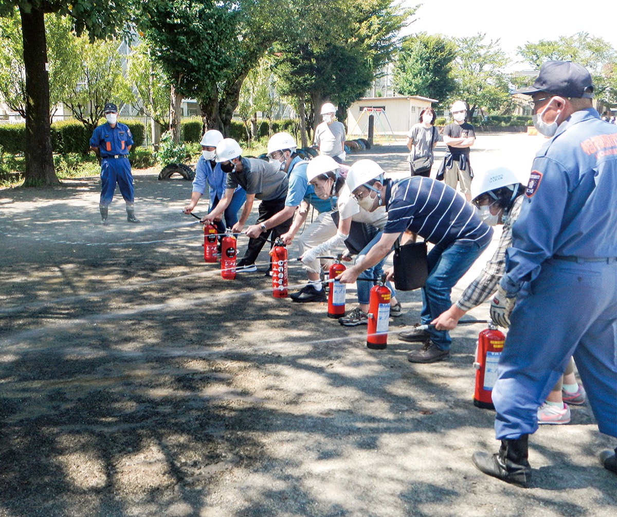 新型コロナの影響で3年ぶりとなった訓練。当日は二本松、相原森下、相原森の上の自治会員ら約100人が集まった。今年は体験型ということで、消火器を使った初期消火、起震車による地震体験、煙体験、AEDの使用体験などが行われた。子どもから高齢者まで、参加者は災害を想定して真剣に取り組んだ。