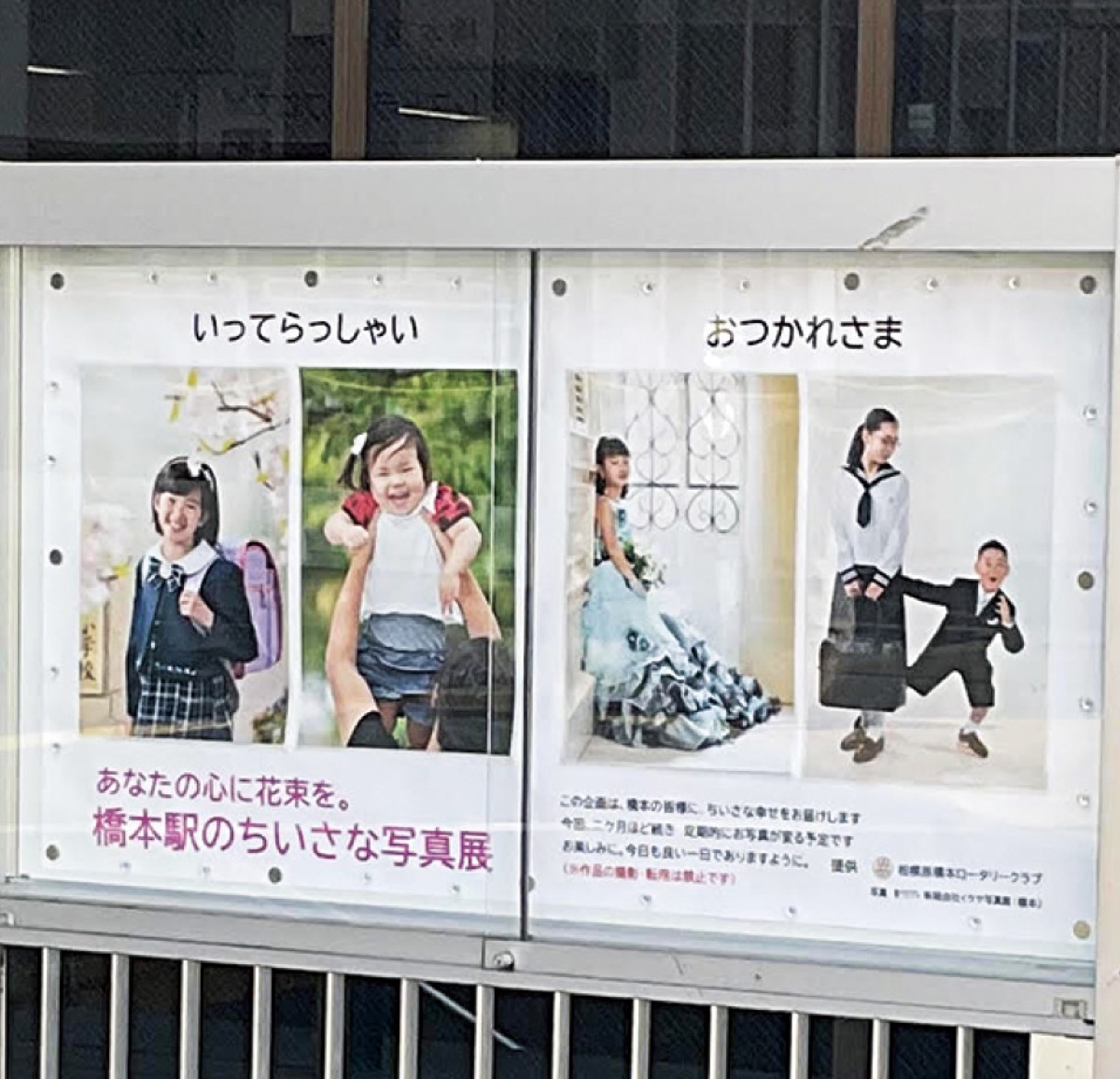 写真は橋本の写真スタジオ「イケヤ写真館」で撮影されたもの。「あなたの心に花束を。橋本駅のちいさな写真展」と題し、2カ月間、週に1回のペースで写真を入れ替える。写真の上には「いってらっしゃい」「おつかれさま」という「駅を利用する人への労い」のメッセージが添えられている。クラブの事業に協力する同写真館の池谷育成社長は「私は30年撮影をしてきて1枚の写真で人と人との愛が深まるのをたくさん見てきました。橋本駅を利用する方々に、お写真を通じてエールを贈ることができれば」と話した。