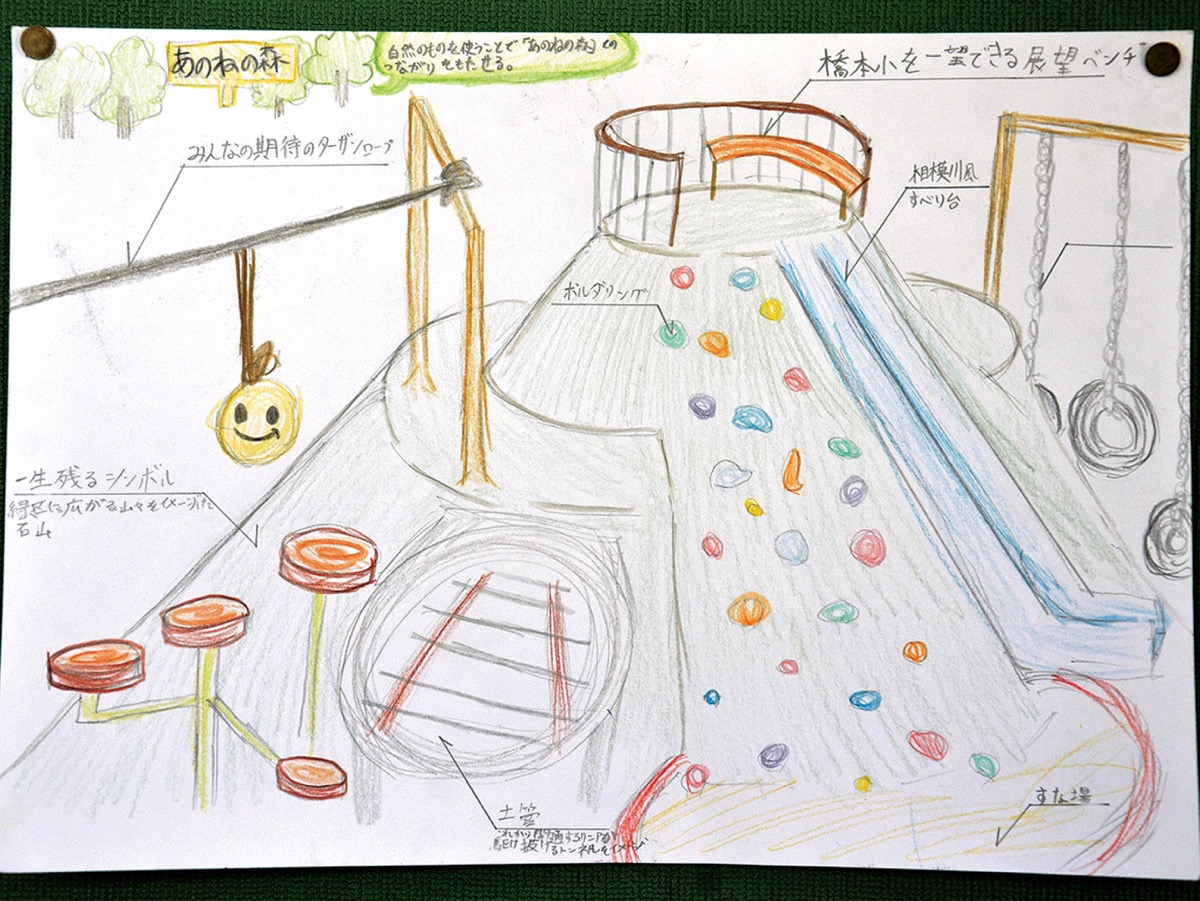 新しく作るアスレチックのデザイン案は佐々木心美さんの案を採用した。佐々木さんのデザイン案は、緑区をイメージして作成。緑区に広がる山々をイメージした石山、相模川をモチーフにしたすべり台、石山の中を通る土管は開通予定のリニア中央新幹線が駆け抜けるトンネルに着想を得た。石山の頂上には展望ベンチ、ターザンロープなどもあり、「自分が楽しめるものを考えて作りました。こんなのがあったらいいなというイメージがみんなにも広がってうれしい」と話す。