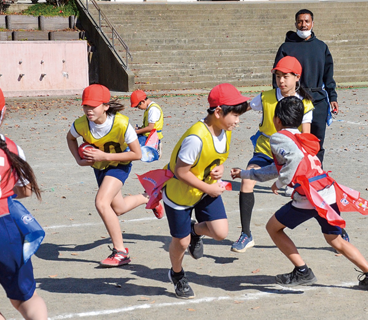 当日は5年生がアメフトの簡易版であるフラッグフットボールに挑戦。この競技はチームメイトと相談して作戦を練ることが魅力で、「ボールを運ぶ人、おとりになる人など誰でも輝けるポジションがあり、仲間の長所を発見できる」とチーム関係者は話す。