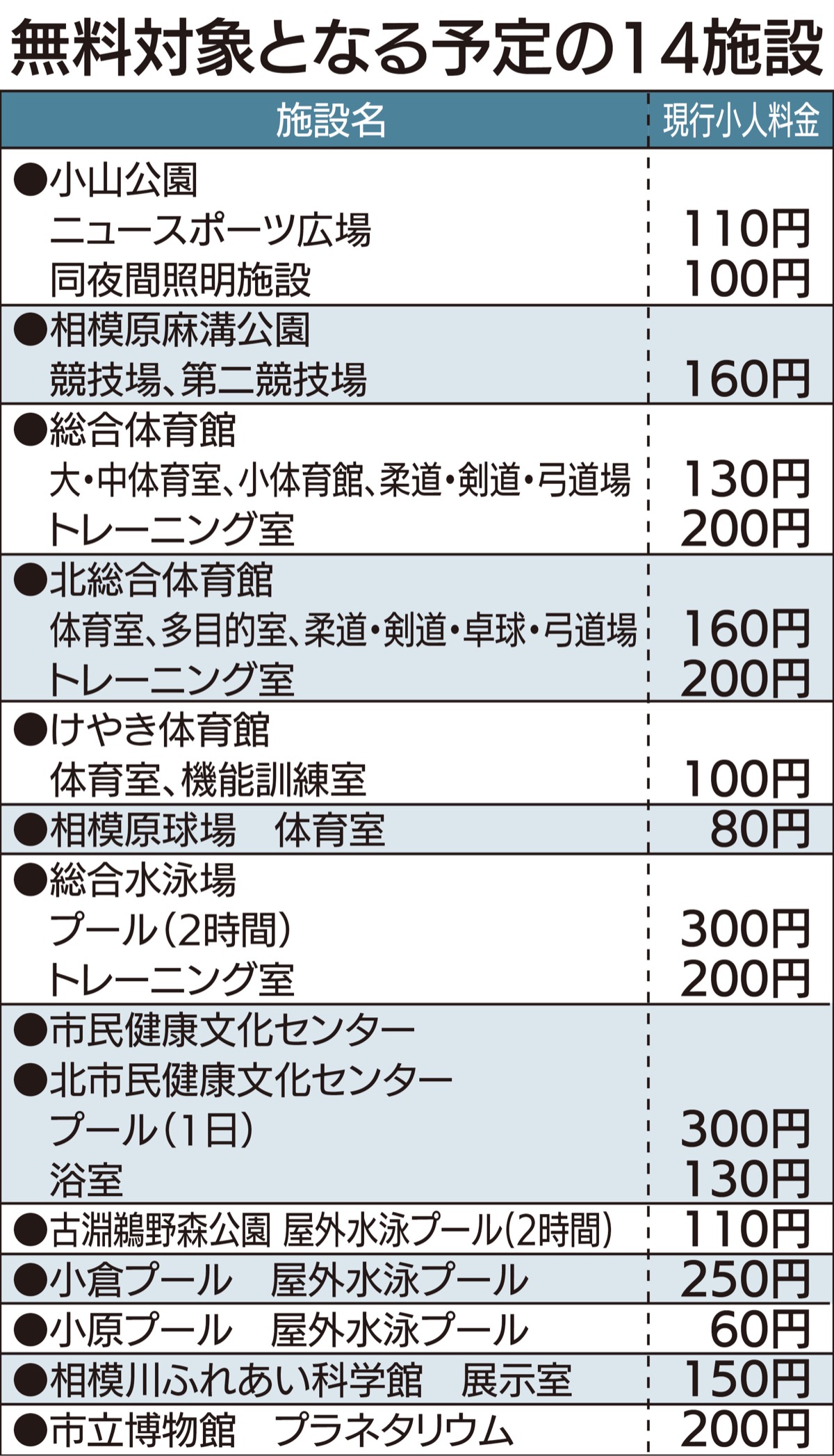 無料となるのは14施設。区内の施設は北総合体育館、北市民健康文化センター、小倉プール、小原プールの4施設が対象となる(表参照)。ほかには、スケートボードなどが楽しめる小山公園やプール、市立博物館のプラネタリウム、相模川ふれあい科学館の展示室など。同課によると、「無料化で子どもの居場所づくりに少しでも役立てば」と期待する。