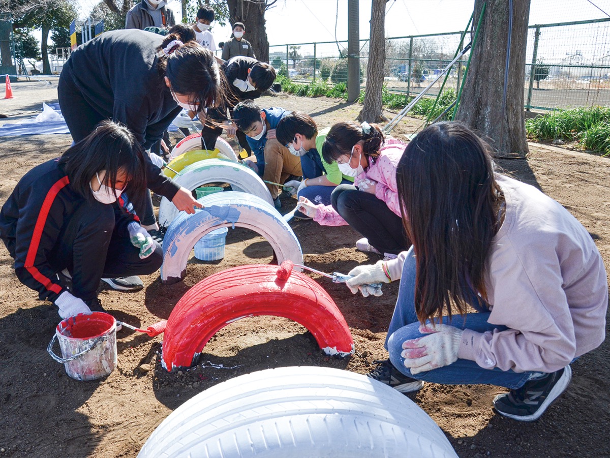 作業の当日は児童がペンキ塗りに挑戦。正門、朝礼台、鉄棒、U字構のベンチなどをローラーとはけを使い、次々と塗っていった。新しく設置したタイヤの遊具は白で下地を作り、赤、青、黄などカラフルな色に仕上げていった。総合学習の遊具チームで実行委員を務める菱山聖太さんは「思った通りに色が塗れてよかった。ぜひ外でたくさん遊んでほしい」と話すと、同じく委員の足立健太さんは「みんなが自主的に動いてくれた。今までボロボロだったので、きれいに仕上がって良かった」と話した。