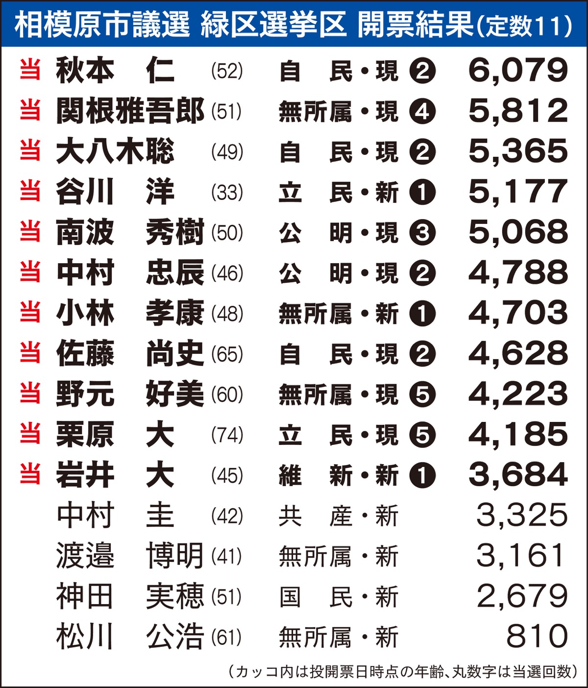 相模原市議会議員選挙が4月9日投開票で実施され、相模原市緑区選挙区(定数11)は、秋本仁氏(52・自民)が6079票の最多得票でトップ当選を果たした。新人トップは谷川洋氏(33・立民)の5177票で、全体でも4位となった。緑区の投票率は46・21%、全市の投票率は45・50%。どちらも政令市となってから過去最低だった。