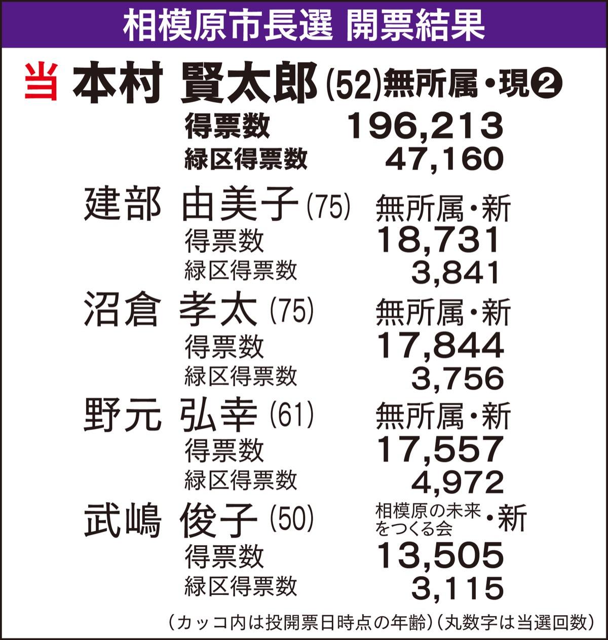 市長選は現職と諸派で新人の武嶋俊子氏、無所属で新人の建部由美子氏、沼倉孝太氏、野元弘幸氏で争われ、実績と知名度を生かした本村氏が勝利。新人4人は橋本駅周辺整備事業に否定的な考えを示すなどしたが、支持拡大には至らなかった。投票率は45・55%。