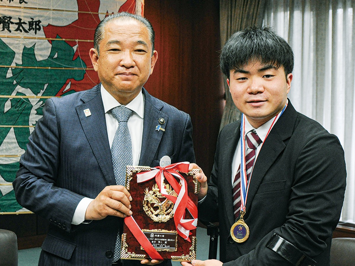 車いすバスケットボールの世界選手権大会で金メダルを獲得した春田賢人選手(20)が4月14日、本村賢太郎市長を表敬訪問した。2024年パリ、28年ロサンゼルスのパラリンピックへの出場を目指して活躍することを約束した。