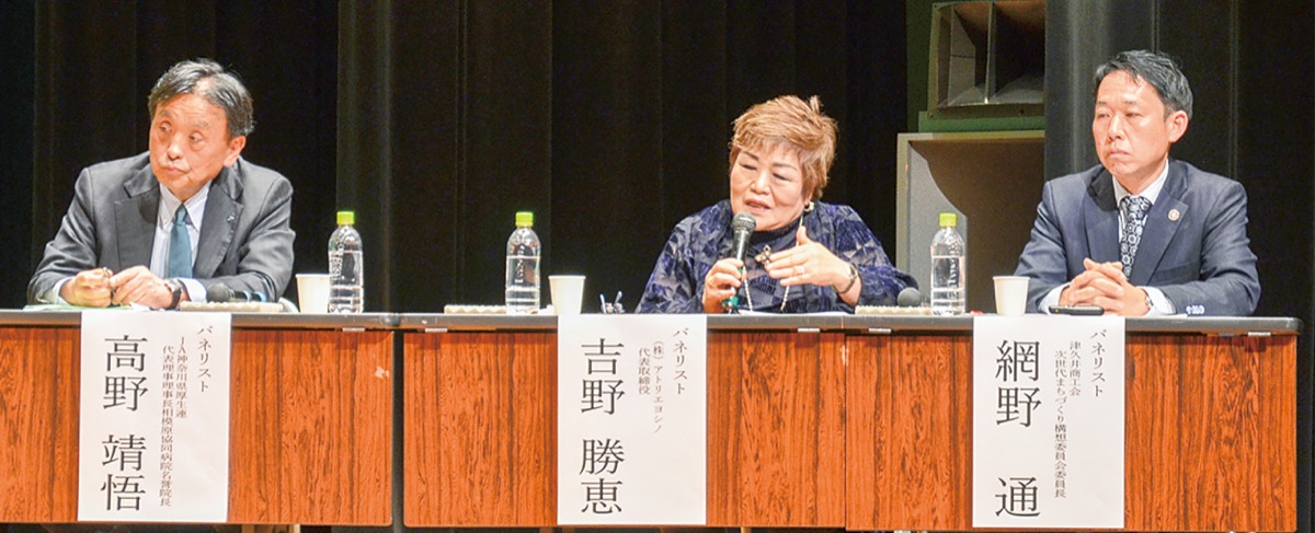続くパネルディスカッションでは黒岩知事をコーディネーターに3人のパネリストがそれぞれの立場で津久井地域の未来を提案=写真。JA神奈川県厚生連代表理事理事長の高野靖悟氏は「自然と医療の共生する津久井地域」の創出、アトリエヨシノ代表取締役社長の吉野勝恵氏は「相模湖に野外劇場を作りたい」とバレエを通じたまちづくり、津久井商工会次世代まちづくり構想委員会委員長の網野通氏はリニア中央新幹線の鳥屋車輌基地への回送線の旅客線化と有人ドローンの活用などを主張した。