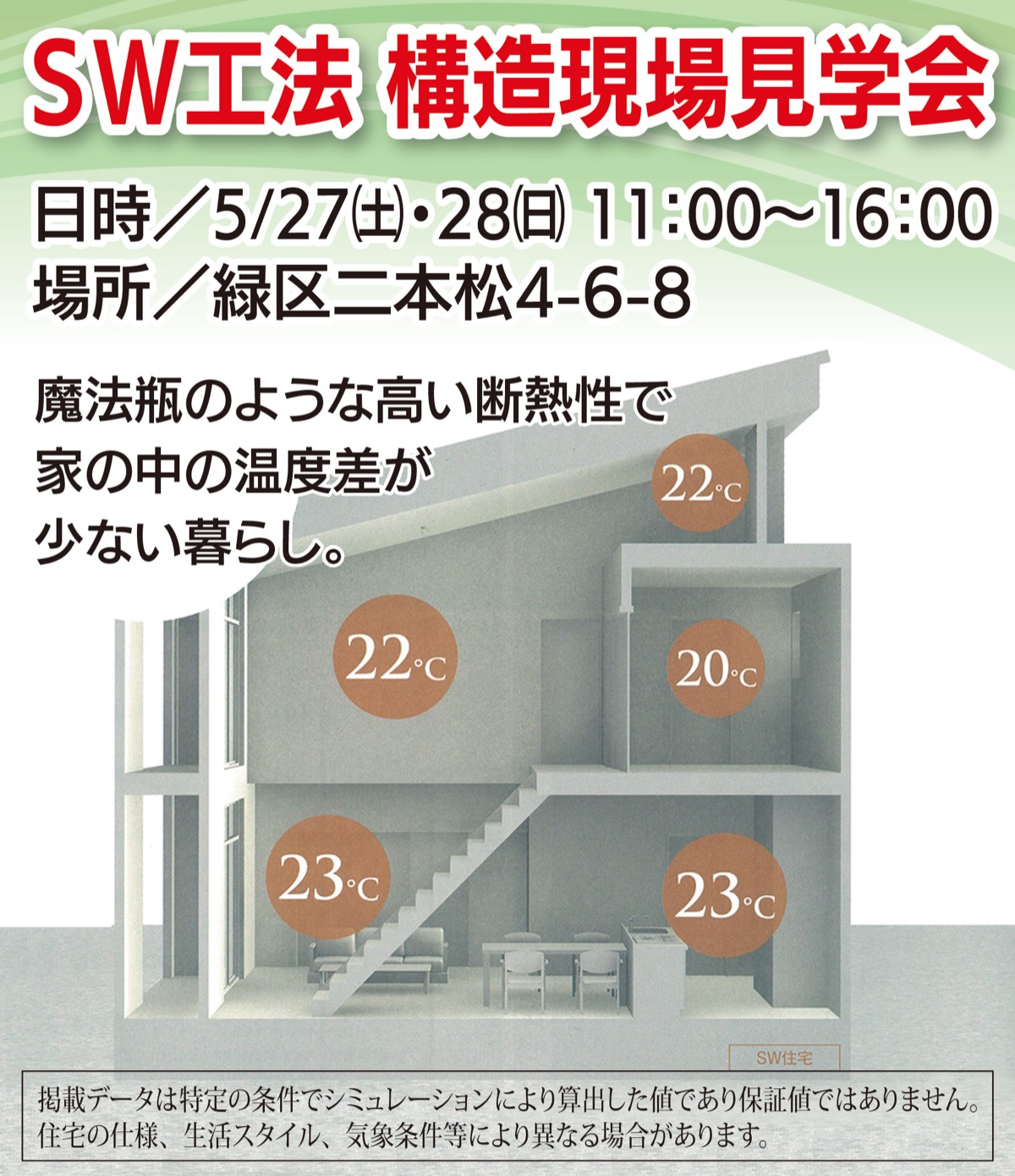 建築途中の家で、直接SW工法の構造を見ることができる「構造現場見学会」を5月27日(土)・28日(日)に開催。時間は午前11時〜午後4時、完全予約制。会場では物件の買取や売却などの相談も可能。問い合わせ・見学会の申し込みは左記へ。