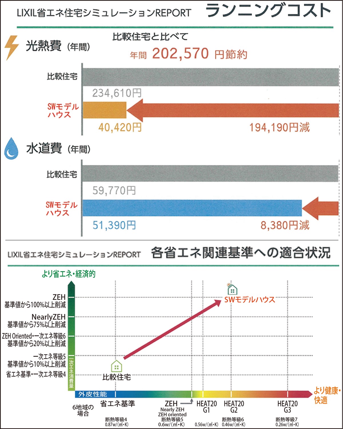 今回、SW工法のモデルハウスとして緑区二本松に建築中の住宅は、このZEH基準をクリアした建物。シミュレーションでも一般住宅より年間約20万円の水道光熱費の削減が可能というデータが出ている(図参照)。