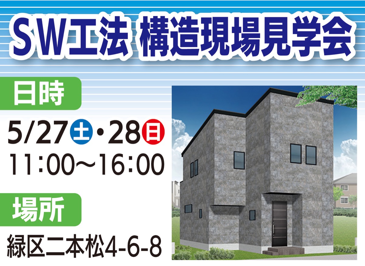 建築途中の家で貴重な構造を見学できる「構造現場見学会」を5月27日(土)・28日(日)の午前11時〜午後4時に開催。完全予約制。物件の買取や売却の相談なども可能。詳細、申し込みは左記へ。