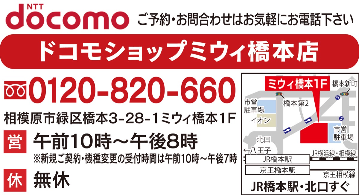 ガラケーの一部(FOMAプラスエリア非対応機種)で使用している「3G回線」が順次終了を迎えている。相模原市内でも、5月末までに大部分の地区で通話・通信に影響が出る予定。これを機に買い換えを検討している人におすすめなのが『ドコモショップミウィ橋本店』だ。