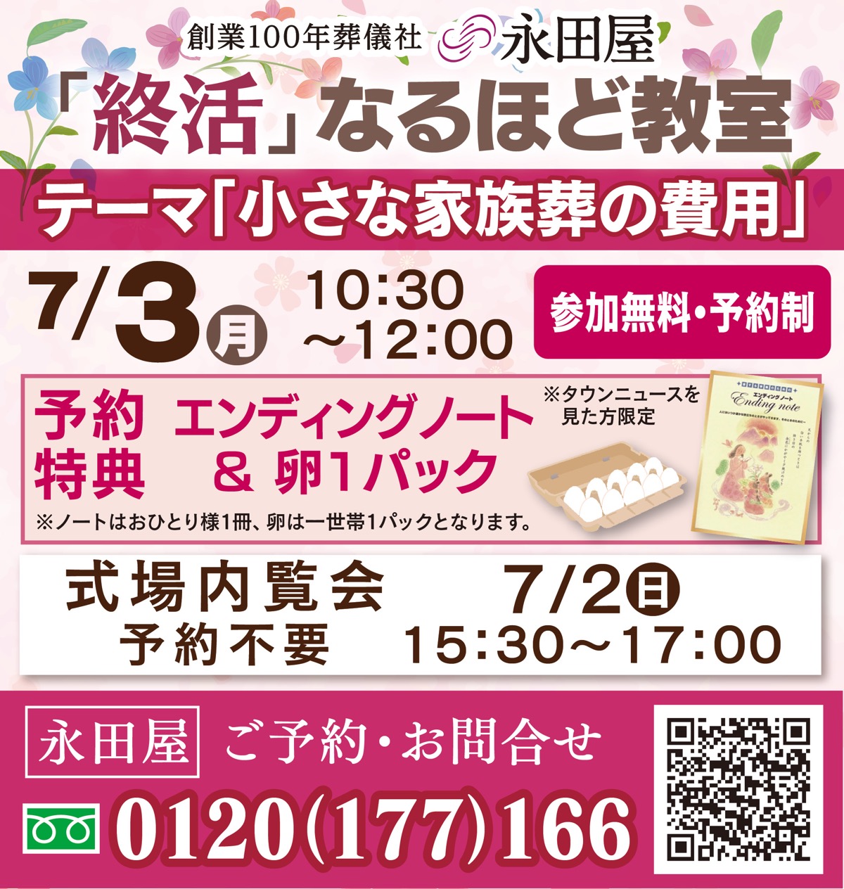 主催は、終活・葬儀についてのセミナー「『終活』なるほど教室」を500回以上開催している創業100年の葬儀社・永田屋。葬儀の現場で実際に活躍している「一級葬祭ディレクター」の講師が分かりやすく解説する。