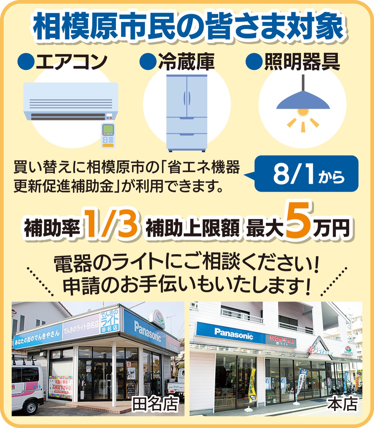 家電の買い替えなら、助成金を活用して地元店でお得意に--。相模原市が一般家庭向けに「省エネ機器更新促進補助金」を実施することを受け、日常の「困った」を解決する「電器のライト」(本店・中央区中央)では、対象の省エネ家電の取り揃えを強化している。