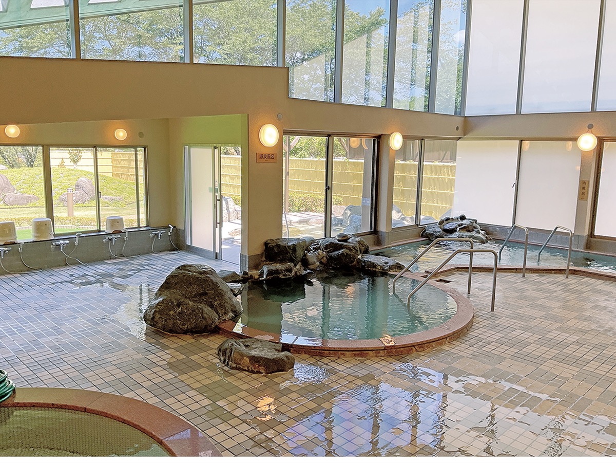 里山が連なる小高い丘の上に位置するやまなみ温泉は、1997年4月に牧野中学校の跡地にオープン。地域に憩いの場を提供してきたほか、市外からも多くの人が訪れる。源泉をそのまま使用しており、成分については「硫酸塩泉、高アルカリ性の泉質で効能が広範囲なのが特徴」と言う。内風呂、水風呂、サウナを楽しむことができ、四季折々の自然を満喫できる露天風呂は人気。周囲の山並みを目線から望むことができ、「夏は緑に染まる里山の自然を満喫してもらえたら」と名久井支配人は話す。