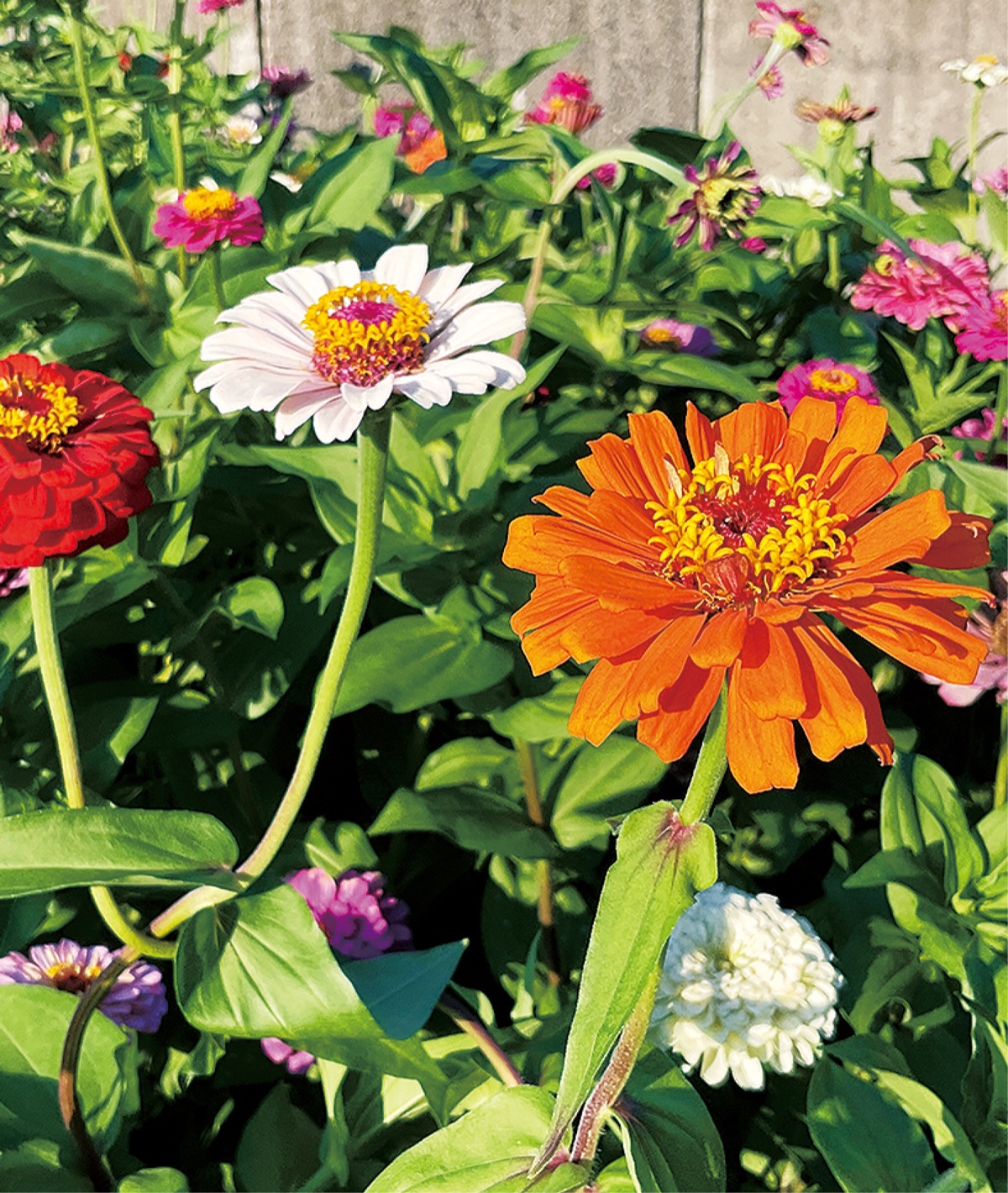 同園の花壇を白、赤、ピンク、オレンジ、黄色などに彩るジニア。花もちが良く、暑さに負けずに開花する特徴から、百日草とも呼ばれる。花言葉は「高貴なこころ」「遠い友を想う」など。同園によると8月いっぱいは彩り豊かな花を楽しめるという。