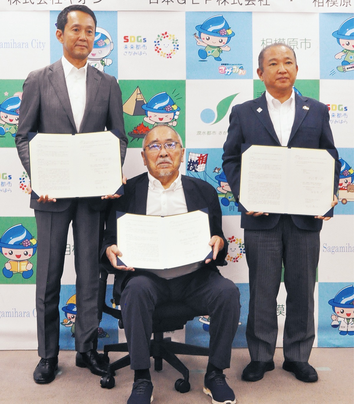 締結式では本村賢太郎市長、ギオンの祇園義久会長、日本GLPの帖佐義之社長が協定書にサインをした。本村市長は「地権者の方に心配をかけたが、ようやく第一歩を踏み出せた。信頼を裏切らない事業にしたい」と意気込みを語った。祇園会長は「この日を待ちに待った。相模原市で創業し、ここまで育ててもらったので、事業に貢献したい」と話し、帖佐社長は「物流の開発を通じて地域への貢献を理念に掲げている。ギオンさんは名士企業であり、取引先でもある。パートナーとして取り組めることは大変光栄」と話した。なお日本GLPは中央区田名の大型物流施設「アルファリンク相模原」を運営している。