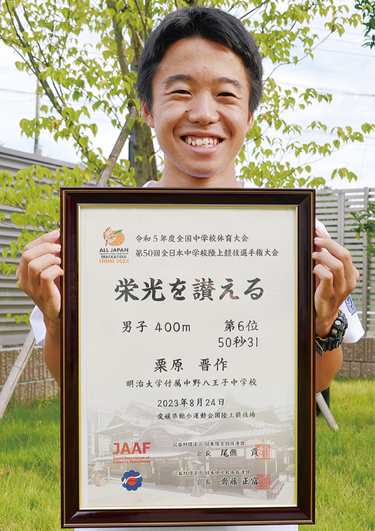 全日本中学校陸上競技選手権大会が8月22日から25日まで愛媛県で行われ、内郷小出身の栗原晋作さん(明大八王子中3年)が男子400メートル決勝に出場。50秒31のタイムで6位入賞した。