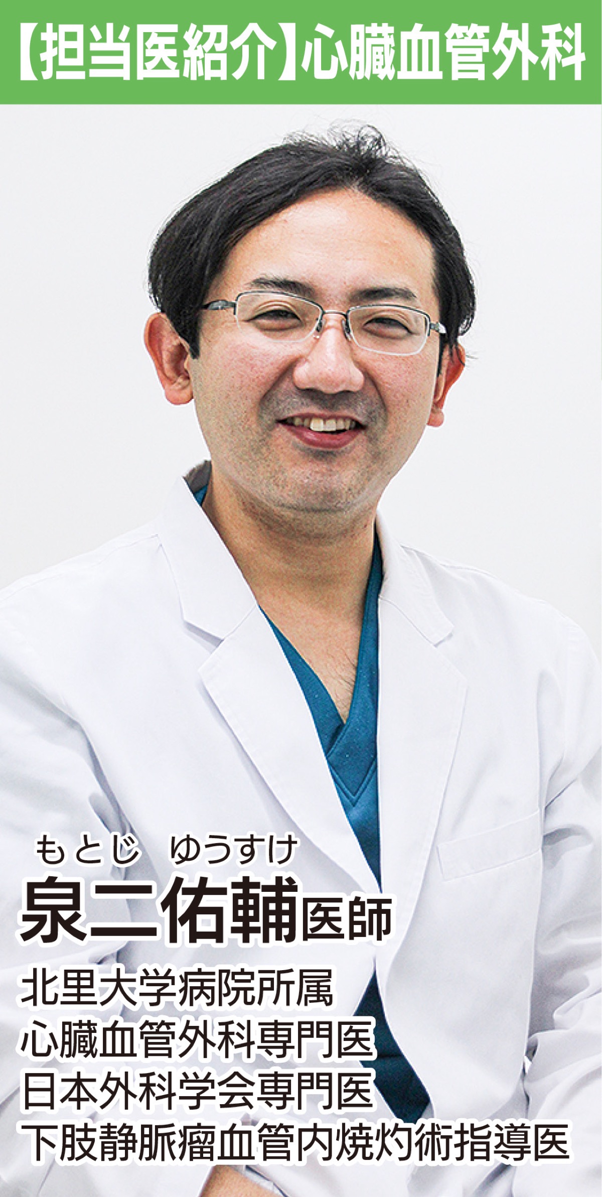 同院では、先進的高周波治療装置(ラジオ波)による血管内焼灼術やストリッピング術、硬化療法など、さまざまな日帰り手術に保険診療で対応。診療日を週4日設け、美容師など立ち仕事の人の要望にも応える。泉二医師は、「困ったら一度受診にお越しください」と話している。